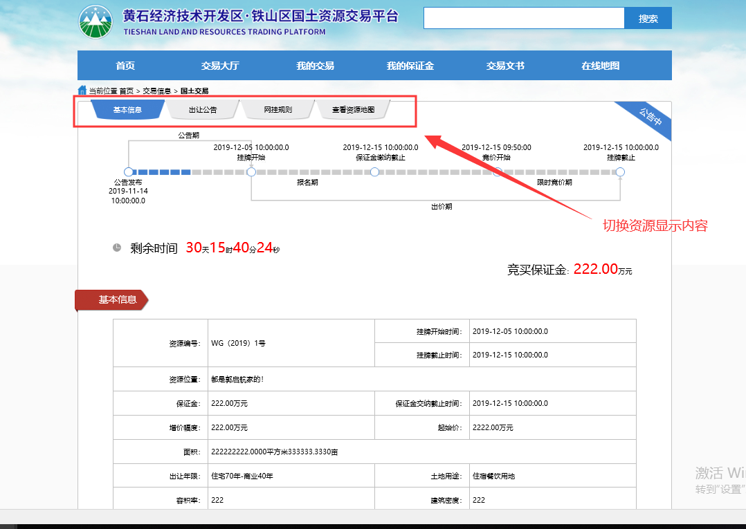 按钮,可查看到资源的基本信息、出让公告、网挂规则、现场图和资源地