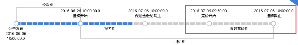 在挂牌截止时间前10分钟,将进入限时报价期,每有竞价人报价,将刷新限时时间,直到10分钟内无